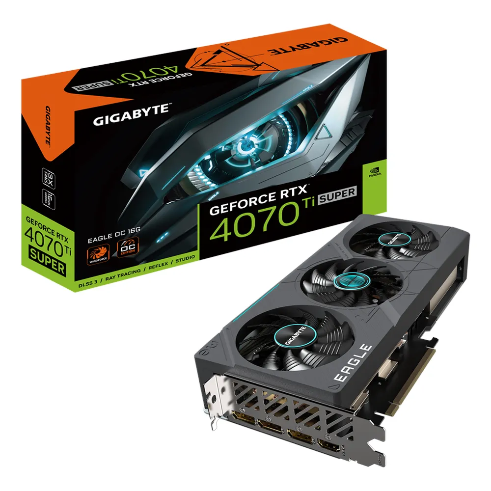Gigabyte EAGLE OC GeForce RTX 4070 Ti Super Graphics Card, GDDR6X 16GB 256-bit Memory, HDMI 2.1a & DP 1.4a Outputs, PCI Express 4.0, 2640 MHz Core Clock, 21 Gbps​ Memory Clock, RGB Fusion, Dual BIOS, Triple Fan Windforce Cooling System, 1 Year Warranty | GV-N407TSEAGLE-OC-16G