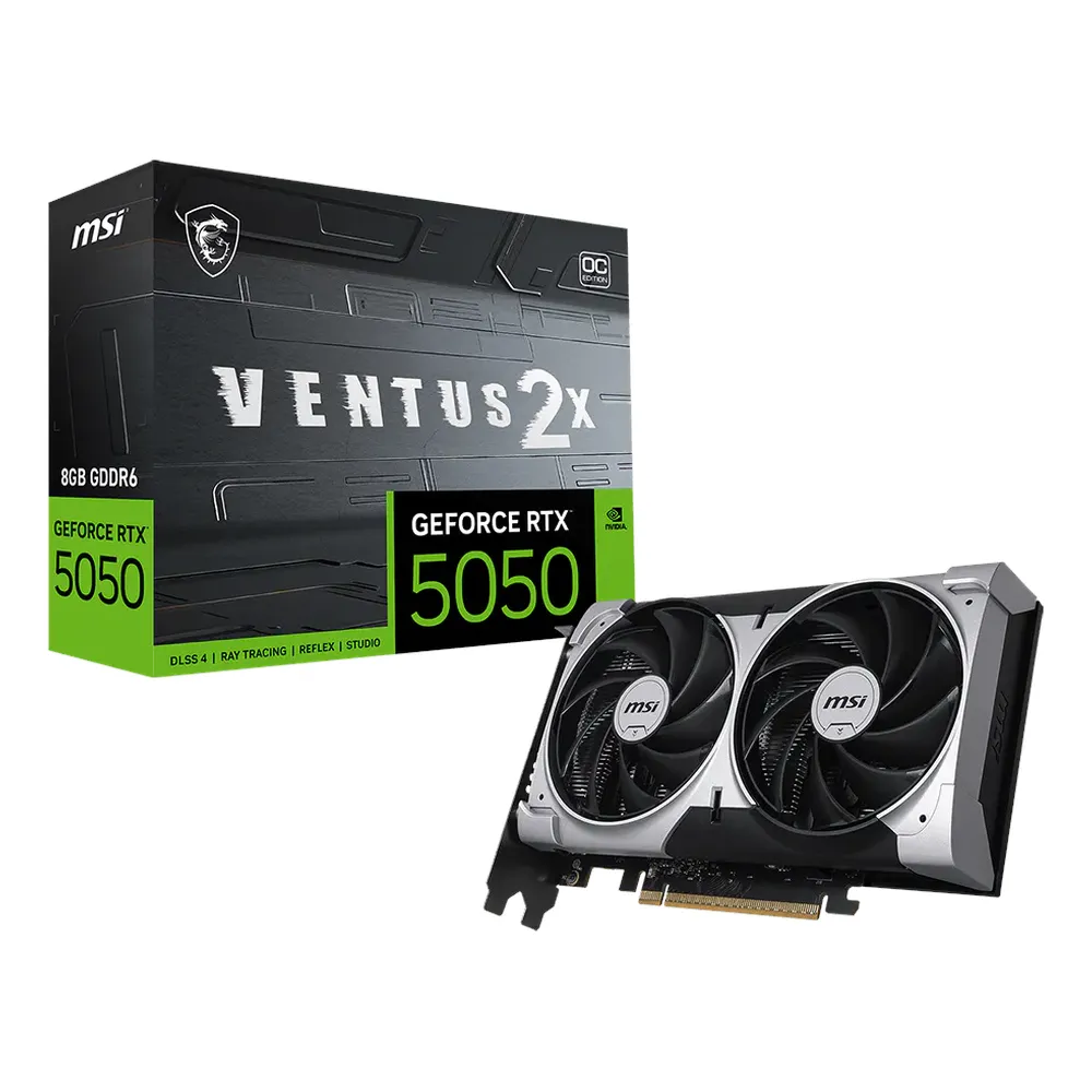 MSI GeForce RTX 5050 VENTUS 2X OC Graphics Card, GDDR6 8GB 128-bit Memory, HDMI 2.1b & DP 2.1b Outputs, PCI Express 5.0, 2617 MHz Extreme Performance Core Clock, 20 Gbps Memory Clock, Dual Fan Cooling System, 421 AI TOPS, 1 Year Warranty | 912-V538-009